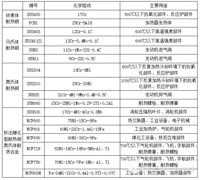 表1 耐熱鋼和耐熱合金的化學(xué)組成和主要用途